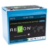 This 12V 75Ah lithium iron phosphate battery is often used in larger applications, including marine, RVs and electronic vehicles. It maintains consistent power and is equipped with an M8 terminal type and a built-in battery management system (BMS). All RELiON LiFePO4 batteries have installation flexibility, fast-charging capabilities and are maintenance free. PRODUCT SPECIFICATIONS Voltage: 12.8V Amp Hours: 75Ah DIMENSIONS & WEIGHT Length: 10.2 in (260 mm) Width: 6.6 in (168 mm) Height: 8.3 in (210 mm) Weight: 23.6 lbs (10.7 kg) APPLICATIONS AWP Electric Vehicles Floor Machines Marine Recreational Vehicles Solar